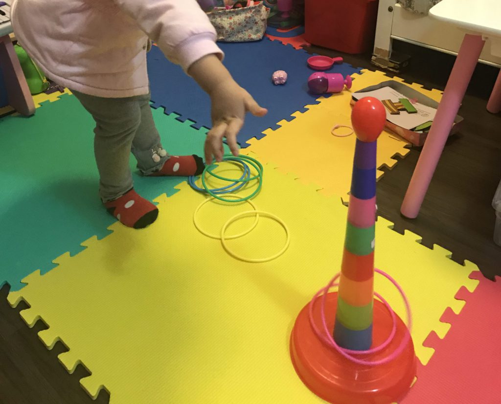 今天的親子遊戲很簡單,就是抛圈圈。與小寶一起玩得十分開心,她會經常抛不到,家長們應說點鼓勵的說話使她們再接再勵地嘗試。因她們的眼手協調未成熟,對她們來說也是頗有難度!有時候,媽媽也會扮作抛不到,她也會向我說鼓勵的說話,小孩就是這樣模仿大人的行徑啊!