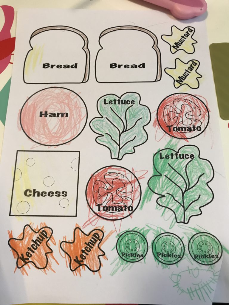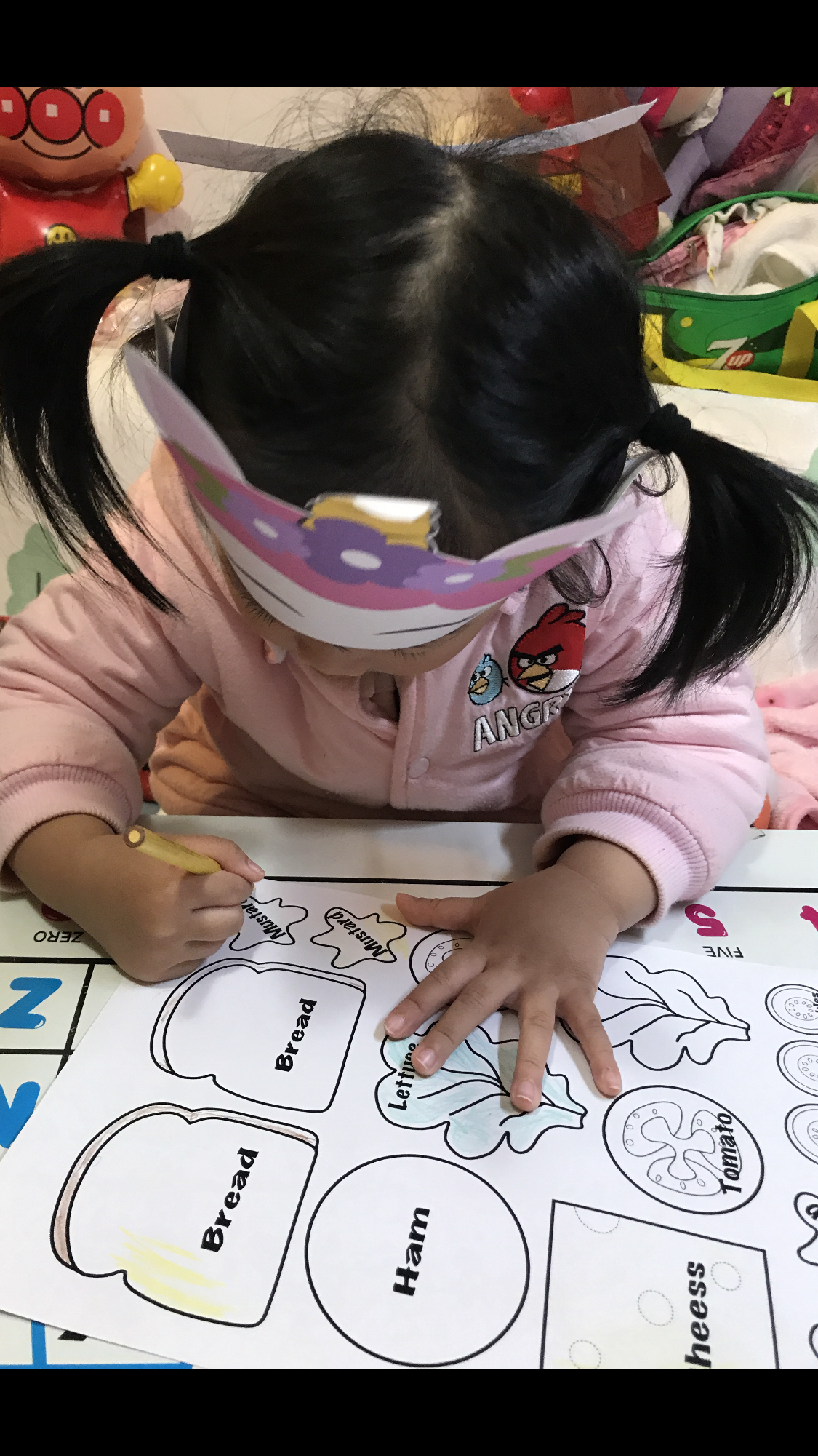 在家中繪畫了三文治的填色圖案給小寶上色。手部肌肉控制進步了,起初上色時可以很用心的,很小塗出界;但到後期心急想剪下來玩就草草了事。
