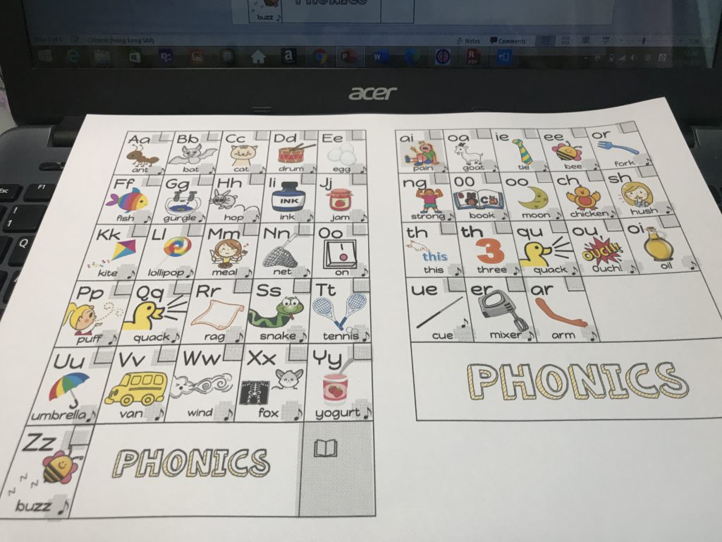 DIY Phonic chart. 按家中小寶學習需要,寶媽則用小達人點字筆配上jolly phonic的mp3音檔,可使小寶易於學習。發音檔及配上歌曲,小寶在唱歌中學習到發音。她對a到z的音素能清楚分辨,接下來便到餘下的ai,oo,er……..