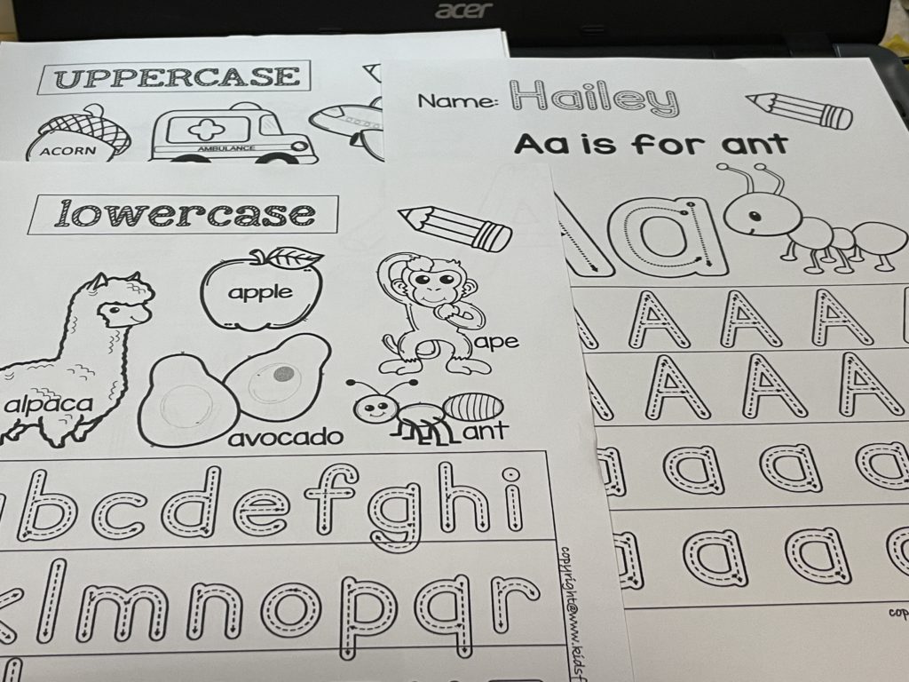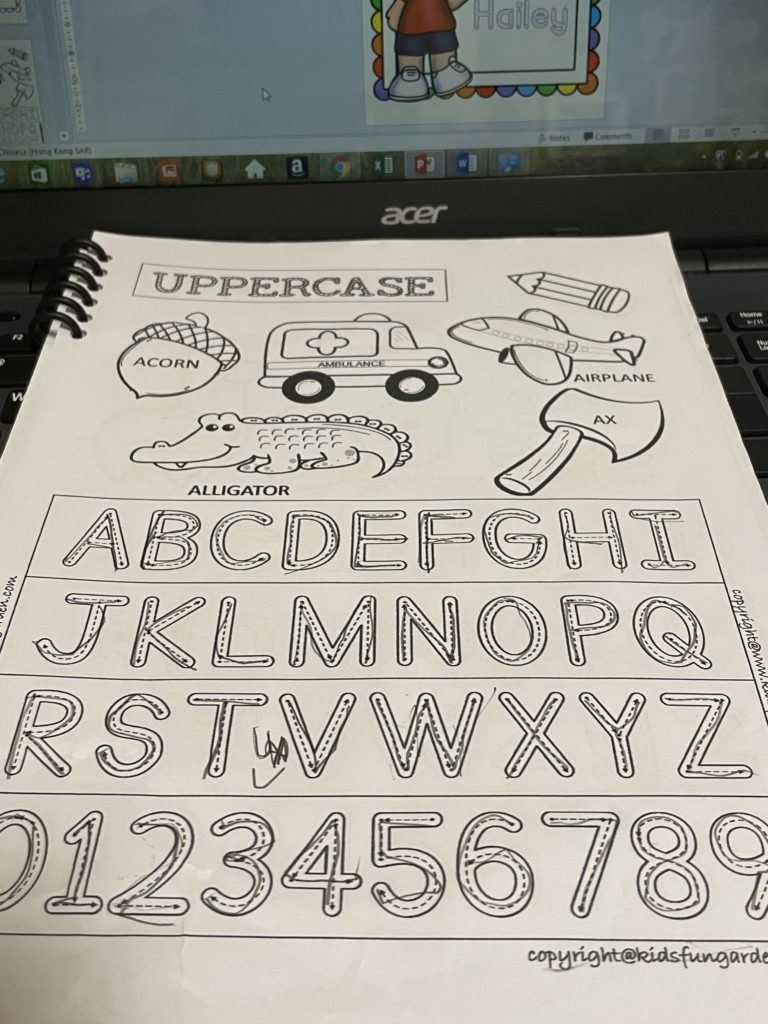 寶媽分別設計了大小皆,A – Z每頁也有大小英文字母的筆順圖,配上圖畫及相關大小皆字框。每頁頂部也配有小孩的英文名字字框,使她能認得及能寫出自己的英文名字。