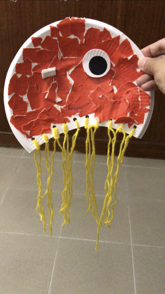 今日第一日學返的親子功練習就是這個紙碟八爪魚,要小寶用小手撲下一片片紅色的碎紙,再要小寶塗上膠水貼上碟上。八爪魚的黃色線條要由小寶負責穿過紙洞,訓練手眼協調!